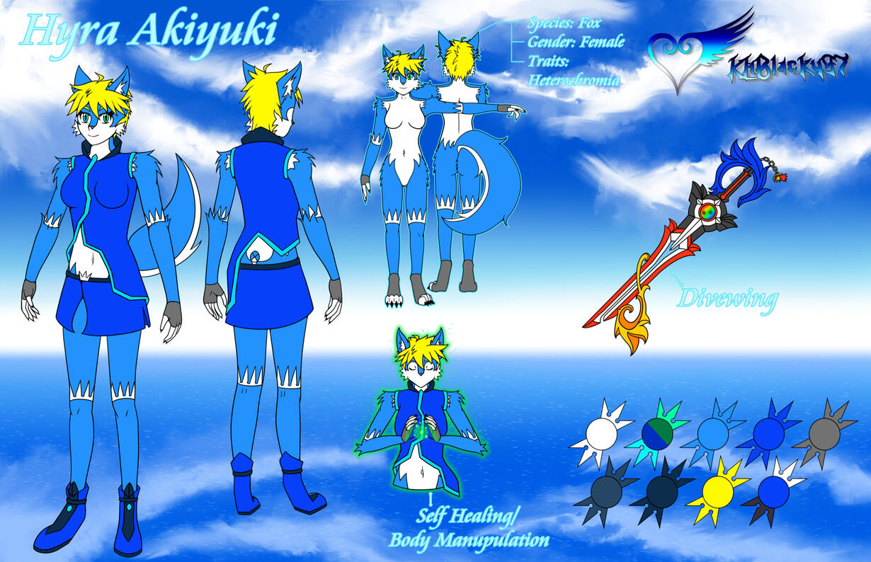 Hyra AkiyukiThe youngest of the two twins and originally a pure blue fox with yellow long hair. After the war, Hyra was left with many injuries, making her look very damaged when compared to others. The only one who approached her was Hyro, who gave her comfort and moral support. After knowing him for a bit, Hyra feels a connection to him and desperately tries to be as close to him as possible; by using her own skill, she tries to heal her body and change it, but falls into a coma from immense usage at such a young age. When she awakes, her appearance changed to match that of Hyro’s, with short hair and various parts of white and grey.A lot of her likings come from watching her brother’s passion for them, so she shares interests with him. At the start, she would live thanks to Hyro’s earnings, but because of unfairness she decides to be a teacher at their local city. Due to her being attached Hyro in most of her youth, she developed some strong feelings towards him and, despite them being brothers, tries her best to support him in the time of need. Even towards everyone, Hyra's a sweetheart and does her best to bring joy to those who she cares for, but can be a bit stubborn at times. Hyra is in the Nabif class and doesn’t hide to Hyro that she’s pretty jealous about him skipping ranks, as much as she cares for him.Under the tutelage of Hyro, she also learned to wield a Keyblade and use magic; even if she excels at water-based magic and healings, she never really liked fighting, so at times she counts more on Hyro’s protection. As such, she doesn’t have too many abilities, contrary to her brother. However, she was born with a special trait: she can manipulate her own body on her own will, ranging from changing the tone of her skin to fast self-healing and other things. Combined with her Subkyn heal and her healing effectiveness is much more efficient than normal. Her Keyblade is “Divewing”, due to her main inspiration from watching Hyro.