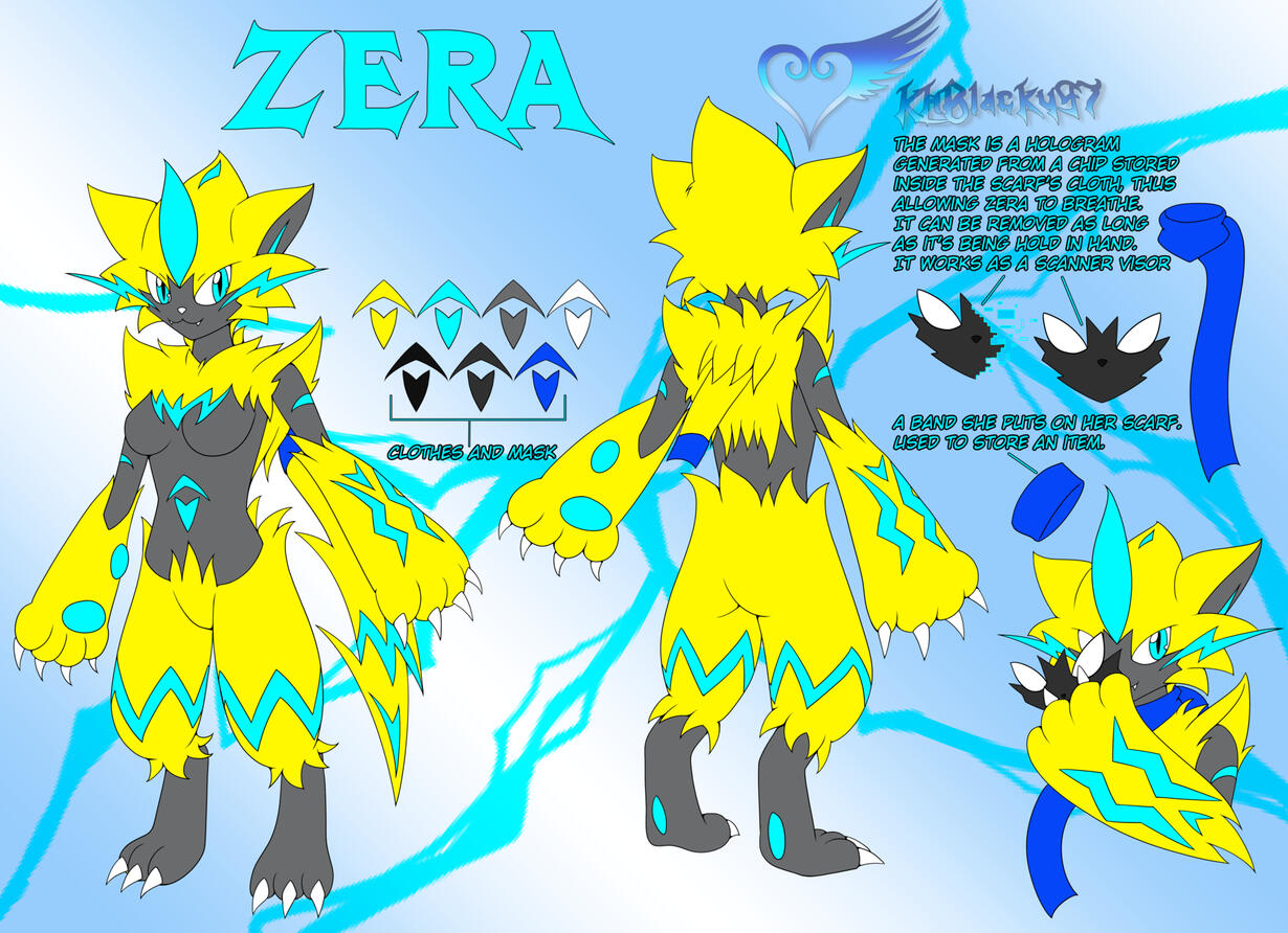 ZeraIn sharp contrast to most of her kind, Zera's body assumed a more feminine figure as well as a gender, thus was originally treated as an outcast. Most of her life was spent alone, surviving to many hardships, until she met her new trainer who took her in. For the first time, Zera shed some tears of joy and found a place called home. The alternative stripes, which showed up later as her body started to mature, symbolize the hardships and bond with her trainer, foreshadowing a potential Battle Bond ability. In battle, she combines a lot of her electric energy into her fists for more efficient close combat.Zera also enjoys superhero comics and shows, so she was given a chip put inside the scarf that generates a holografic visor. With that on, she really feels into the superhero mood. While also keeping with the theme, she never developed a secondary Kyn.